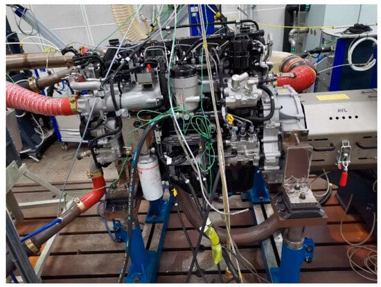 The engine used in the experiments is a four-stroke, six-cylinder, liquid-cooled engine, model YCS06270-60 (Guangxi Yuchai Machinery Co., Ltd., Yulin, China). It features a cylinder bore of 105 mm, a stroke of 120 mm, and a displacement of 6.234 L. The firing order is 1-5-3-6-2-4, with a compression ratio of 17.1. The engine operates on 0# diesel fuel, and the injector injection pressure is 180 MPa. Engine speed is controlled by adjusting the dynamometer’s speed. Additionally, the engine is equipped with a turbocharger, and the intake pressure is 0.1 MPa. The engine test bench is depicted in Figure 1, and the detailed engine specifications are provided in Table 1. The reference diesel was employed, which complies with the requirements of appendix D in GB 17691-2018 Limits and measurement methods for emissions from diesel fueled heavy-duty vehicles (CHINA VI).