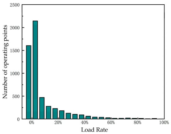 Figure 2 presents a statistical analysis of the LLC operating conditions. The full cycle consists of 5519 operating points, of which 4220 points (76.5% of the total cycle) have a load rate below 10%. There are 509 points with a load rate between 10% and 20%, and 310 points with a load rate between 20% and 30%. Operating points with a load rate below 30% account for 91.3% of the total cycle time. Within the LLC cycle, idling time makes up 36% of the total duration, while both acceleration and deceleration phases accounting for 32% each.