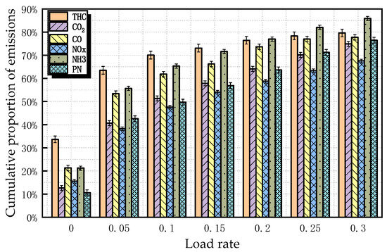 Figure 3 visually illustrates the trend of pollutant proportions as a function of load rate. It can be observed that all pollutants exhibit a rapid increase in their cumulative emissions below a 30% load rate. Specifically, in the load rate range of 0% to 30%, the cumulative emissions of common pollutants exceed 67%, with NH3 reaching 85.8%. The emission trends for different pollutants vary. Unburned HC and CO experience a sharp increase in the 0% to 5% load rate range. This is primarily due to the low combustion temperatures and reduced engine speeds at low loads, which result in higher emissions of unburned products, thereby increasing specific emissions across the entire test cycle. In contrast, NOx shows a much slower increase within the 0% to 30% load rate range. At low loads, the in-cylinder temperatures are lower, leading to reduced NOx formation. Nevertheless, the cumulative proportion of NOx still reaches 67% at load rates below 30%. Unburned hydrocarbons account for 63.5% of their cumulative emissions at load rates below 5%, while CO and NH3 also exceed 50% of their cumulative emissions at a 5% load rate.