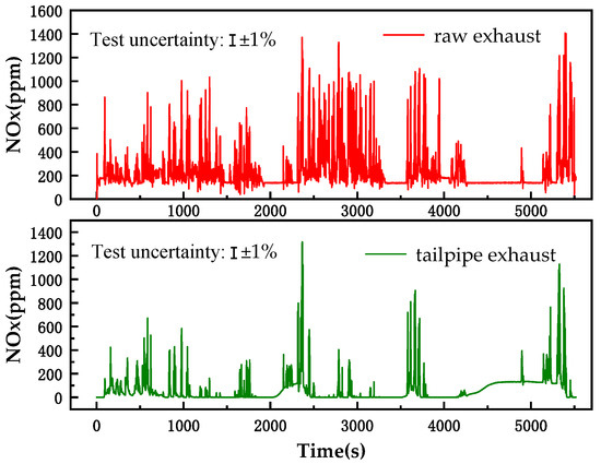 Figure 4 illustrates the temporal variation of NOx emissions during the low-load cycle. The term “raw exhaust” refers to the gases emitted directly from the engine combustion process before passing through any after-treatment systems, while “tailpipe exhaust” refers to the gases that have been processed by the after-treatment system. In the raw exhaust, the majority of NOx levels are observed to range from 140 ppm to 400 ppm. Notably, during idling conditions, stable periods occur between 1884 s and 2308 s, 3276 s and 3569 s, and 4232 s and 5134 s, where low fuel injection, inefficient combustion, and reduced in-cylinder temperatures result in NOx levels around 140 ppm. Due to substantial transient variations and limited operation under high-load conditions, higher NOx emissions are infrequent and not concentrated, with the peak emission reaching 1407 ppm. Following after-treatment, the NOx levels in the exhaust are substantially reduced. However, transient operating conditions cause the NOx content in the tailpipe exhaust to fluctuate. There are specific periods of elevated NOx levels, observed between 2041 s and 2074 s, 3573 s and 3812 s, and 4280 s and 5410 s, with the highest value reaching 1316 ppm. These fluctuations can be attributed to prolonged idling periods before these intervals, which lead to deteriorated combustion and a continuous decrease in exhaust temperature, thereby diminishing the efficiency of the after-treatment system. In particular, the relatively stable idling condition between 4232 s and 5134 s caused NOx levels in the tailpipe exhaust to begin rising from 4267 s, stabilizing at 131 ppm between 4598 s and 5137 s. As engine load increased, the raw exhaust NOx emissions also increased. However, the temperature of the after-treatment system did not rise immediately, resulting in a period of elevated NOx emissions in the tailpipe exhaust. The calculated NOx emission value is 775.48 mg/kWh, exceeding both the World Harmonized Transient Cycle (WHTC) test limit (460 mg/kWh) and the World Harmonized Steady-State Cycle (WHSC) test limit (400 mg/kWh) stipulated by China VI regulations. Therefore, it is essential to implement measures to reduce NOx emissions during low-load conditions to comply with current emission standards.