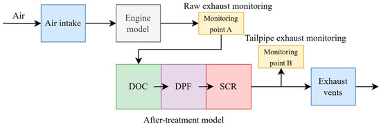 The exhaust gases pass through the exhaust pipe and enter the after-treatment system, as illustrated in Figure 5. Initially, the exhaust undergoes pre-treatment, during which unburned fuel vapor is condensed into liquid form. A fuel converter then transforms the unburned fuel into a THC mixture, which is suitable for processing in the DOC. The exhaust next enters the DOC, where catalytic oxidation occurs to remove CO and THC. After exiting the DOC, the exhaust gas flows into the DPF for soot removal. Urea is then injected into the exhaust stream, where it undergoes thermal decomposition to produce NH3. The NH3 subsequently reacts with NOx in the SCR catalyst. A monitoring point is set up within the SCR to measure the concentrations of NH3 and NOx, allowing for real-time adjustments to the urea injection rate. Finally, before the exhaust is released into the atmosphere, another monitoring point measures the concentrations of various emissions in the tailpipe. The parameters in the after-treatment model align with those of the actual engine’s after-treatment system.