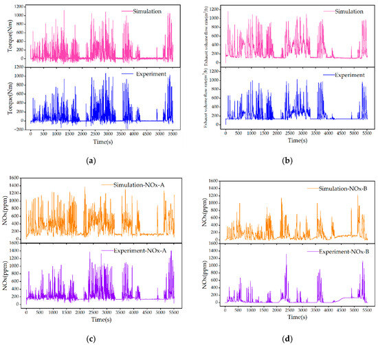Results of LLC simulation: (a) Torque, (b) Exhaust volume flow rate, (c) Raw NOx, and (d) Tailpipe NOx.