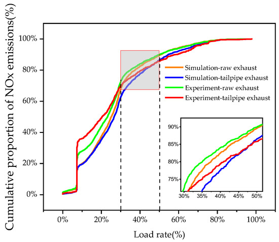 The cumulative NOx emissions for crude exhaust and tailpipe emissions were calculated, as shown in Figure 7. Below 30% load rate, the cumulative NOx emission trend is similar for experimental and simulated conditions. Specifically, the raw exhaust emissions between the experiment and the simulation were almost identical, with a maximum cumulative absolute error of 8.2%, while the exhaust emissions in the experiment were higher compared to the simulation. The absolute error of the tail row of the test and simulation is 16.7% at 10% load, but with the increase in load rate, the error in the cumulative original row is stable within 10%. Between 30% and 50%, the maximum cumulative emission error is 6.9%.