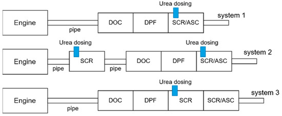 Figure 8 illustrates a schematic diagram of the after-treatment system. After-treatment system 1 represents the current experimental setup in use. After-treatment system 2 features a front-mounted SCR, incorporating a small SCR unit and urea injection system into the existing configuration. After-treatment system 3, on the other hand, includes a rear-mounted SCR, which adds an SCR unit at the rear of the existing system. In the front-mounted SCR configuration, the exhaust pipe length from the engine to the original after-treatment system remains 2000 mm. The front-mounted SCR is positioned within this length without altering the overall exhaust pipe length. The urea injection system regulates the amount of urea injected based on the concentrations of NO and NO2 in the exhaust, the exhaust temperature, and the NH3 concentration detected after the SCR.