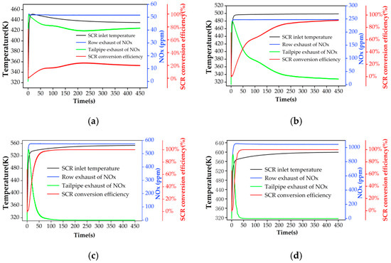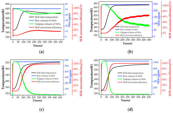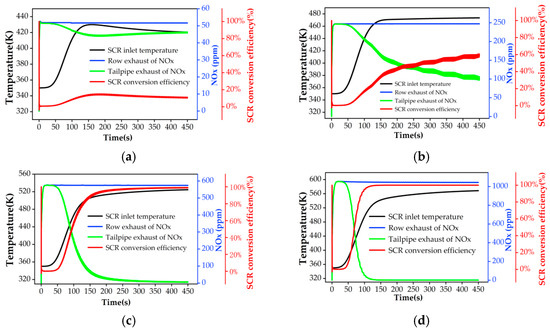 Figure 9 presents the after-treatment efficiency and SCR inlet temperature under low-load conditions, based on simulations of the experimental after-treatment model (system 1). In the figure, (a), (b), (c), and (d) correspond to the fuel injection amounts per cycle. The black curve represents the change in SCR inlet temperature. The blue and green curves represent the changes in NOx concentration of the raw exhaust and tailpipe emissions. The red curve indicates the SCR conversion efficiency. The axis colors correspond to the curve colors. As shown in Figure 9a, although very low loads result in reduced NOx production within the cylinders, they also lead to lower exhaust temperatures, which in turn significantly diminish SCR conversion efficiency. From Figure 9b–d, it is evident that as fuel consumption per cycle increases, combustion efficiency improves, leading to higher exhaust temperatures at the SCR inlet and a corresponding increase in after-treatment efficiency. When the SCR exhaust temperature ranges between 400 K and 500 K, NOx emissions decrease, and SCR conversion efficiency increases notably. Furthermore, as fuel consumption per cycle rises, exhaust temperature further increases, and the duration of low SCR conversion efficiency during cold engine start-up is significantly reduced.