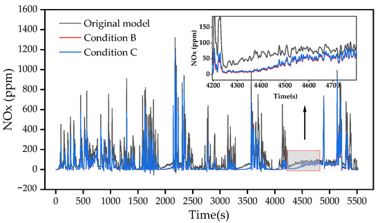Figure 12 presents the simulation results of NOx tailpipe emissions for a six-cylinder engine equipped with a front-mounted SCR. By selecting operating onditions B and C, it is evident that the front-mounted SCR significantly reduces NOx emissions and enhances after-treatment efficiency. This improvement is primarily attributed to the effective utilization of exhaust heat, particularly under low-load conditions. As shown in the figure, during relatively stable low-load conditions around 2000 s, 3500 s, and 4500 s, NOx emissions from the front-mounted SCR system are notably reduced, leading to a corresponding increase in after-treatment efficiency. However, between 4800 s and 5000 s, NOx emissions exhibit an upward trend, likely due to the extended idling period. This increase can be explained by the prolonged low-load operation, which causes the exhaust temperature in the after-treatment system to drop further, falling below the optimal range. As a result, the reaction between NOx and NH3 is less effective, leading to higher NOx emissions. Figure 13 illustrates the simulation results of NOx tailpipe emissions for operating conditions B and E, where all parameters remain identical except for the start-up method. It is clear that the overall trends in NOx emissions for both conditions are similar. However, during the first 500 s, the NOx emissions during a hot start are significantly lower than those observed during a cold start, due to the differences in the start-up procedures.