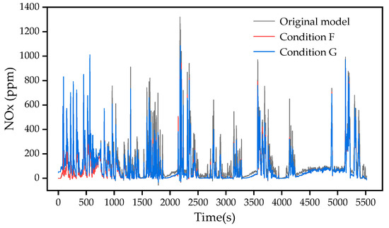 Figure 14 presents the simulation results of NOx tailpipe emissions for a six-cylinder engine equipped with a rear-mounted SCR, specifically under operating conditions F and G. All other parameters remain the same, with the sole distinction being the start-up method between the two conditions. It can be observed that the overall NOx emission trends for both operating conditions F and G are similar, with emissions lower than those observed in the original model simulation. Notably, during relatively stable low-load conditions around 2000 s and 3500 s, the NOx emissions are consistently lower compared to the original model. However, around 4500 s, during another period of stable low-load operation, the NOx emissions gradually approach the values of the original model simulation. This can be attributed to prolonged low-load operation, which depletes the ammonia stored in the rear-mounted SCR. Additionally, during the initial 700 s, NOx emissions during hot start are significantly lower than those during cold start, due to the differences in the start-up methods. However, it is important to note that the reduction in NOx emissions with the rear-mounted SCR system is less significant than that observed with the front-mounted SCR system.