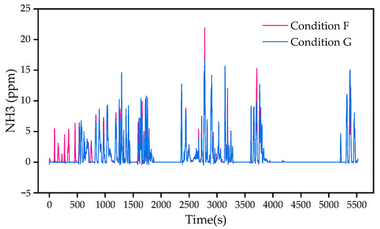 Figure 15 shows the simulation results for NH3 tailpipe emissions for the same six-cylinder engine with a rear-mounted SCR, again for operating conditions F and G. The emission trends for NH3 under both conditions are similar. In the first 500 s, NH3 emissions during hot start are significantly higher than during cold start, due to the differing start-up methods. This suggests that the lower temperature during cold start leads to reduced urea injection, resulting in lower NOx conversion efficiency. The data also indicate that the majority of the NH3 concentrations in the tailpipe remain below 10 ppm, with only a few instances exceeding 15 ppm. Overall, NH3 emissions stay well within regulatory limits.