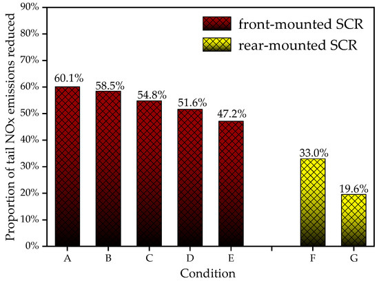 Figure 16 presents a comparison of integrated NOx tailpipe emissions from various front-mounted and rear-mounted SCR models against the original model simulation. By analyzing operating conditions A, B, C, D, and E, it is evident that the proximity of the SCR to the engine influences NOx conversion efficiency. Specifically, the closer the SCR is to the engine, the higher the NOx conversion efficiency, although the reduction in NOx levels tends to plateau beyond a certain point. Notably, a dual SCR system demonstrates superior NOx reduction and enhanced after-treatment efficiency.