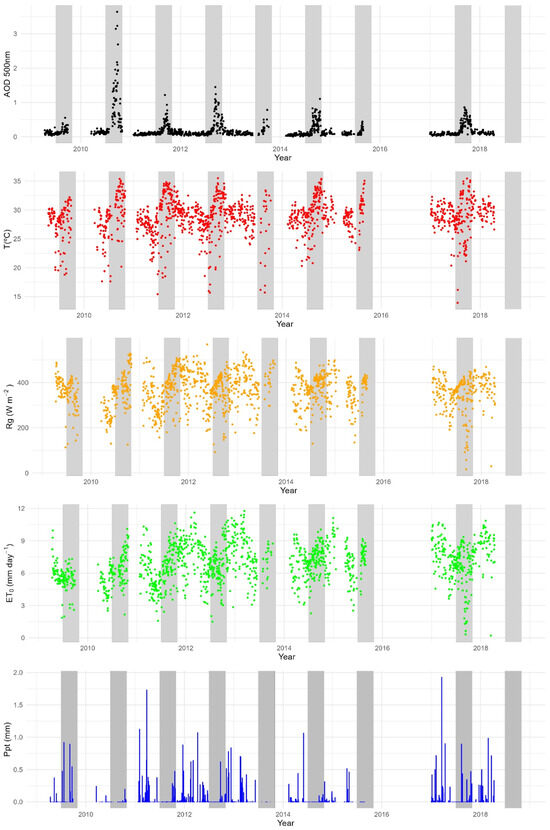 Relative humidity (RH) is a key factor in controlling evapotranspiration and is directly linked to local atmospheric dynamics. The RH graph over the years (see Figure A1), reveals a distinct seasonality, with the minimum values observed between August and September. These months correspond to the period of the highest AOD levels, highlighting the interaction between aerosol concentrations and atmospheric processes. RH significantly influences the hygroscopic growth of aerosols, which refers to their ability to absorb water and increase in size under humid conditions. Climatic seasonality directly affects , with hygroscopic aerosols enhancing atmospheric humidity by absorbing water vapor, thereby reducing the availability of water for evapotranspiration [32,33]. Although the AOD in this study is used as a global indicator of aerosol load in the atmospheric, it is well-established that aerosols in the region predominantly originate from biomass burning, such as BC. While BC itself is not hygroscopic, it is often associated with hygroscopic compounds like sulfates and nitrates, which influence the ability of aerosols to interact with atmospheric moisture.