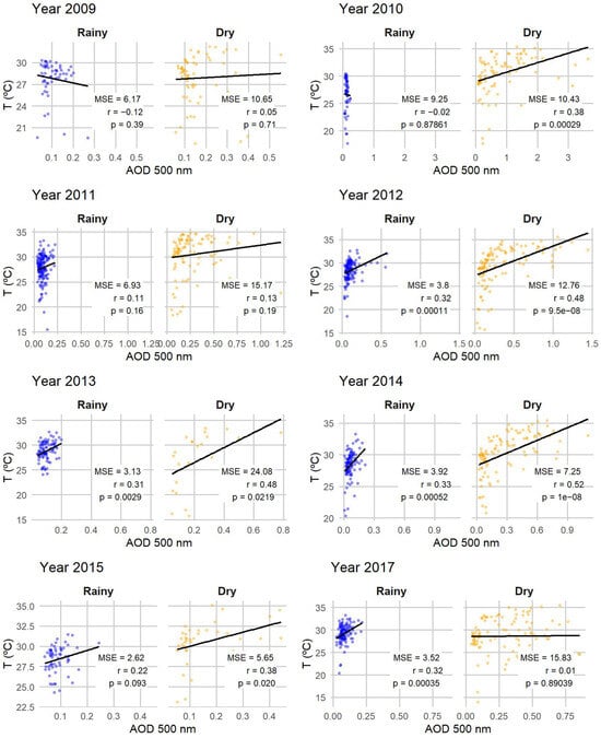 Relationship between air temperature (T) and aerosol optical depth (AOD at 500 nm) during the rainy and dry periods in the years 2009, 2010, 2011, 2012, 2013, 2014, 2015, and 2017. The trend lines indicate the relationship between the variables, showing the correlation coefficient (r), mean square error (MSE), and significance value (p).