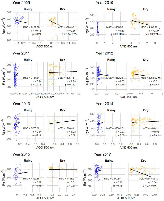 When comparing the two seasons (Figure 4), it is evident that during the rainy season, only 2010 showed a statistically significant correlation between the AOD and Rg, with a correlation coefficient of r = −0.32. This negative value indicates a moderate inverse relationship, suggesting that in 2010, as the AOD increased, Rg tended to decrease. In contrast, the dry season showed statistically significant correlations in multiple years. The strongest correlation occurred in 2009, with r = −0.56, indicating a moderate to strong negative relationship. In 2010, the correlation was r = −0.39, which is still negative but weaker. In 2012, a weak negative correlation (r = −0.21) was observed, while 2017 showed a stronger negative correlation of r = −0.54. Furthermore, the analysis of mean square error (MSE) values indicated that data dispersion was higher during the rainy season, while the dry season exhibited lower MSE values, supporting the stronger correlations observed during this period.