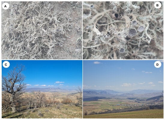 (A,B) Thallus of Anaptychia setifera displaying key morphological features. (C,D) Semi-arid habitat of the species, highlighting its characteristic environment.
