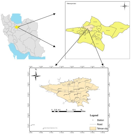 The Tehran metropolis is located in the north of Iran and has a population of approximately 8.7 million inhabitants. Since people from the surrounding cities commute daily to Tehran for work or study, during the day, the population can exceed 12.5 million people []. The average relative humidity of the air is about 40%, and the prevailing wind is westerly []. The topographic and meteorological conditions contribute to the inadequate quality of air in the Tehran metropolis. At an altitude of 1050–1800 m asl and encircled by the Alborz mountain range, the city is susceptible to air pollution [].