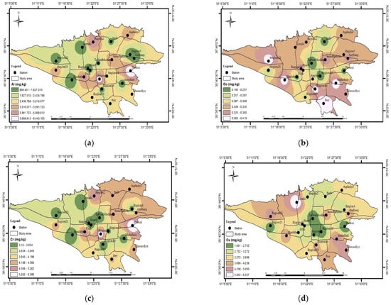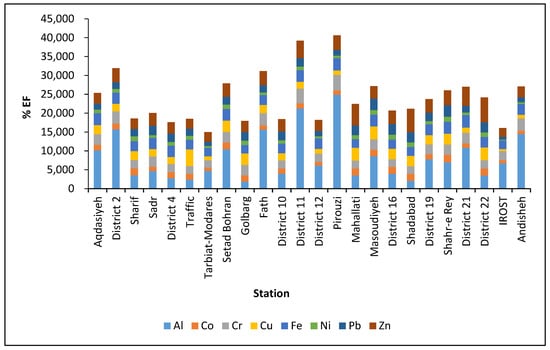 In addition to lithogenic sources, other factors, such as the lack of green spaces and vegetation cover, industrial activities, and emissions from fuel combustion, can contribute to the elevated concentrations of Al and Fe in the atmosphere []. The distribution maps of these toxic elements and the EFs showed that the highest concentrations of Al and Fe were observed at the Pirouzi station and District 21 station. The low density of vegetation and the presence of highways and road dust in these areas, as well as the presence of the Tehran-Karaj road and the intensification of dust caused by vehicle traffic, are the main factors of Al and Fe concentrations.