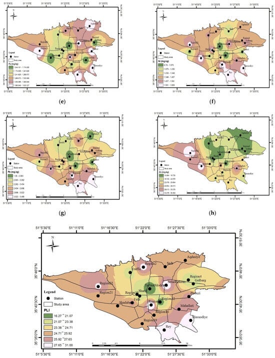 Ni and Co toxic elements are naturally present in small quantities in the soil []. However, human sources such as dust from mining and construction materials, motor vehicles, fossil fuel combustion, and lubricating oils are potential emission sources of Co and Ni [,]. Based on the zoning map of these two toxic elements in the study area, the highest concentrations were found at the Shahr-e Rey station (District 20) in the south of the Tehran metropolis. The highest values of the pollution load index and the contamination factor of the Co and Ni toxic elements were observed in the Shahr-e Rey station. The population density, the slope of Tehran, the existence of industries such as the margarine factory, the cement factory, the petrochemical refinery, and the burning of fuel oil and the use of fossil fuels in the surrounding factories and industries may have led to an increase in the concentration of Co and Ni at this station.