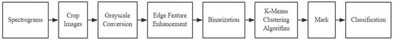 This paper applies image processing techniques and unsupervised clustering algorithms to the above-obtained spectrograms to identify EMP events. The flowchart of the identification algorithm is shown in Figure 2. First, the spectrograms are batch cropped, then converted to grayscale. Next, vertical edge enhancement is applied, followed by binarization of the enhanced image. The binarized image is then subjected to unsupervised clustering using a K-means clustering algorithm. Finally, the clustered results are marked and classified.