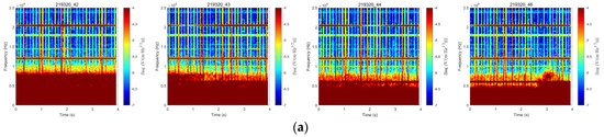 The Tonga volcanic eruption event occurred within the monitoring range of the CSES, orbit number 219320. The monitoring range of this orbit spans the following geographic coordinates: longitude range: −166.363° to 143.475°, latitude range: 69.7087° to 69.1676°, and the altitude ranges from 520.849 km to 503.097 km. During this event, the Tonga volcanic eruption occurred within the observation range of the orbit, and the CSES sensors were able to capture the changes in the ionospheric electromagnetic field caused by the eruption in real time. The VLF waveform data observed in this orbit were transformed into 4 s spectrograms using Fourier transform and subsequently analyzed using the aforementioned experimental process. Through experimental validation, it was found that the Tonga volcanic eruption generated a 16 s EMP sequence, distributed across four spectrograms, as shown in Figure 12.