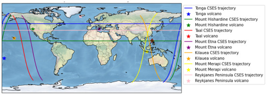 Figure 13 illustrates multiple volcanic eruption events and their corresponding CSES satellite trajectories. In the figure, the colored curves represent the CSES observation trajectories during different volcanic eruptions, while the star-shaped markers in various colors indicate the locations of the respective volcanoes. This figure intuitively presents the observation paths of the CSES during different volcanic eruptions, providing a spatial reference for studying the impact of volcanic eruptions on the electromagnetic environment. By analyzing this figure, the relationship between CSES trajectory coverage and EMP phenomena can be explored along with the spatial distribution characteristics of EMPs, further verifying the effectiveness of CSES observations in detecting EMP events. It can be observed that the CSES trajectories cover several major volcanic eruption areas, with some trajectories passing near the eruption centers, which may provide favorable conditions for the effective detection of EMP signals.