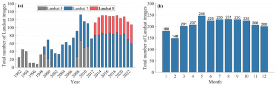 Number of Landsat image observations in the Lake Sarez region: (a) annual observation counts from 1992 to 2023; and (b) total monthly observation counts from 1992 to 2023.