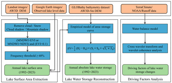Based on the aforementioned understanding and research gaps, the aims of this study were as follows: (1) to generate an annual LSA using all available Landsat images and, in conjunction with bathymetric data and high-resolution DEM, to construct a precise interannual series of absolute LWS changes in Lake Sarez from 1992 to 2023 and analyze its temporal evolution characteristics, providing a more comprehensive understanding of long-term LWS variations; and (2) to employ a water balance model and wavelet analysis to comprehensively investigate and analyze the driving factors behind the absolute LWS changes in Lake Sarez and their underlying mechanisms, contributing to improved disaster risk management and regional water resource strategies.
