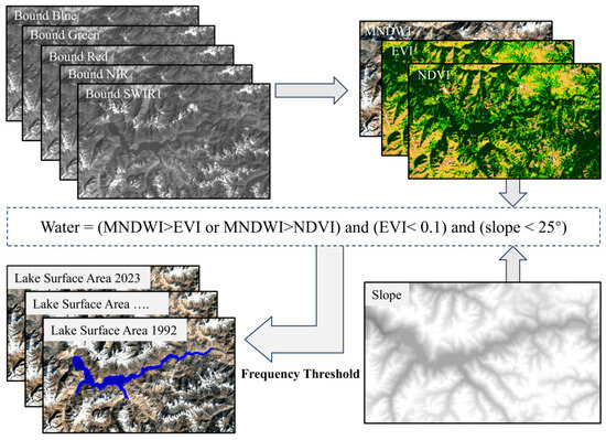 This study applied a multi-index threshold method (Figure 4) that integrated the modified normalized difference water index (MNDWI) [64], enhanced vegetation index (EVI) [65], and normalized difference vegetation index (NDVI) [66] to enhance water body extraction [67]. MNDWI has been extensively applied in the extraction of water bodies [64], and studies have shown that combining MNDWI with other indices, such as MNDWI > EVI or MNDWI > NDVI, more effectively distinguishes water bodies from non-water bodies [68]. Additionally, applying an EVI threshold of less than 0.1 effectively filters out vegetation pixels and those containing a mix of water and vegetation [69]. Ultimately, pixels that fulfill both the (MNDWI > EVI or MNDWI > NDVI) and (EVI < 0.1) conditions are classified as water bodies. This efficient and simple method can be quickly and reliably applied to all available images for subsequent water body frequency calculations. It has been extensively used for surface water and lake extraction in regions with diverse climatic conditions, such as the Inner Mongolia Plateau [69], Central Asia [70], and the headwater areas of the Three Rivers on the Qinghai–Tibet Plateau [71]. The formulae for these methods are as follows: