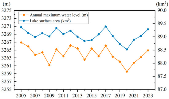 The extracted LSA of Lake Sarez was further validated for temporal reliability by comparing it to the observed annual maximum lake level from 2005 to 2023. As shown in Figure 5, the extracted LSA exhibited strong consistency with the observed maximum lake levels, demonstrating a significant Pearson correlation coefficient of 0.802 (p < 0.01). This robustly confirmed the high accuracy and reliability of the extracted LSA, rendering it suitable for subsequent research.