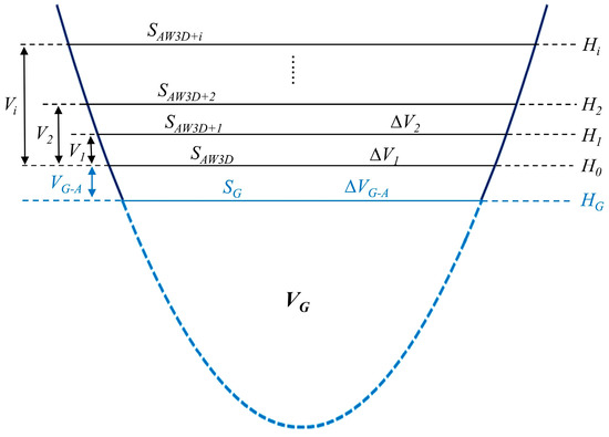 - The elevation was increased from H0 in 1 m increments up to 15 m, determining the relationship between each elevation Hi and the corresponding area SAW3D+i (where i = 1, 2, …, 15), as shown in Table 4 (Columns 1 and 3).