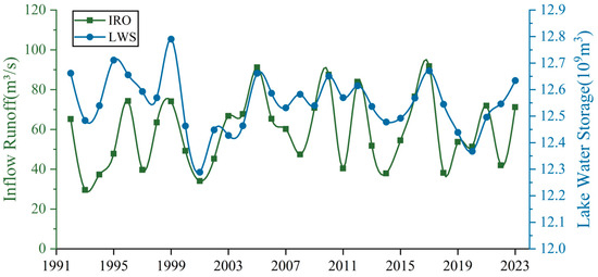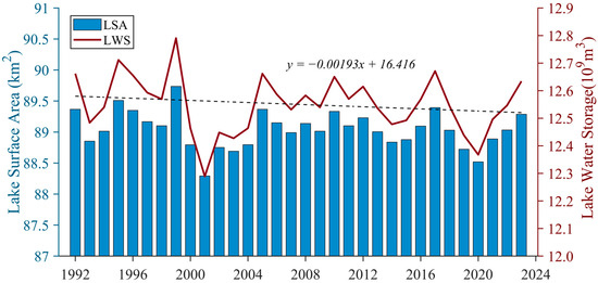 Using bathymetric data and the area–storage curve (Table 4), we computed the absolute LWS changes in Lake Sarez from 1992 to 2023 (Figure 8). A strong linear relationship exists between the LWS and LSA, described by the equation y = 3.4715x − 183.61, with R2 = 0.99. Over the past 32 years, the LSA of Lake Sarez has shown an overall slight decline, decreasing by 0.176 km2 at a rate of 0.055 km2 per decade. The average annual LSA is 89.04 km2, with the largest LSA recorded in 1999 at 89.74 km2 and the smallest in 2001 at 88.29 km2, resulting in a range of only 1.45 km2. Although the LSA of Lake Sarez remained relatively stable within a range of only 1.45 km2, this does not imply that its hydrological characteristics were stable. As a deep lake, LSA changes do not fully capture hydrological dynamics, necessitating the further analysis of the absolute LWS changes. As shown by the folded line graph in Figure 8, the reconstructed absolute LWS ranged from approximately 12.3 × 109 to 12.8 × 109 m3. The absolute LWS and LSA change synchronously but with different magnitudes. The linear trend of the absolute LWS from 1992 to 2023 was negative. A Mann–Kendall trend test on the absolute LWS changes yielded a Z value of −0.92, below the 90% significance level, indicating a non-significant overall decrease over the past 32 years at a rate of −0.019 × 109 m3 per decade. The annual average absolute LWS is 12.55 × 109 m3, with the highest in 1999 at 12.79 × 109 m3, and the lowest in 2001 at 12.29 × 109 m3.
