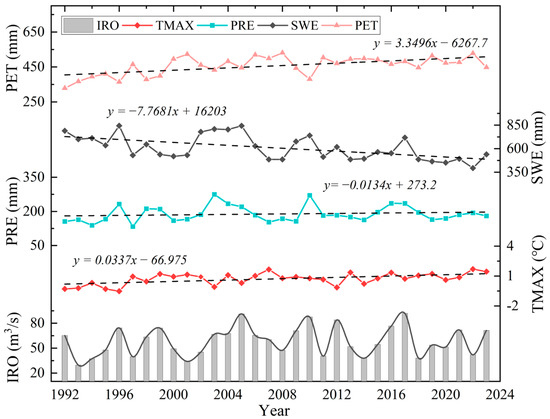 To explore the climate drivers of absolute LWS changes in Lake Sarez, we analyzed precipitation (PRE), the annual maximum temperature (TMAX), potential evapotranspiration (PET), and snow–water equivalent (SWE), as these factors are closely tied to variations in the LSA and absolute LWS [49,50]. Precipitation and temperature are key drivers, while the snow–water equivalent is included because of its significant impact on water volume through freeze–thaw processes. The watershed boundary of Lake Sarez, covering an area of 19,564 km2, was defined using the level-six HydroBASINS dataset, and served as the region for meteorological data analysis [37]. Temperature, precipitation, potential evapotranspiration, and snow–water equivalent data for the watershed were obtained from the TerraClimate dataset. This dataset, derived through climate-aided interpolation, merges high-resolution climate normals from WorldClim with time-varying lower-resolution data from additional sources [51]. TerraClimate generates a monthly dataset that includes variables such as temperature, precipitation, vapor pressure, wind speed, and solar radiation with a spatial resolution of 1/24° (approximately 4 km), and has been widely applied in climate and hydrological research [52,53]. The TerraClimate dataset for the Lake Sarez watershed, including TMAX, PRE, PET, and SWE from 1992 to 2023, was accessed via the GEE platform.