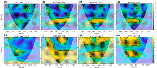 The cross-wavelet transform (XWT) combines wavelet transform and cross-spectral analysis, enabling the exploration of correlations between two time series within the time-frequency domain at various time scales. Higher XWT values indicate that the two time series share high-energy regions, suggesting a stronger correlation between them [85,86]. In this study, XWT was used to analyze the correlation between the dominant factors of absolute LWS and climate and atmospheric circulation factors across multiple timescales, highlighting their relationship in high-energy regions of the time–frequency domain. For two time series x(t) and y(t), the expression for XWT is as follows: