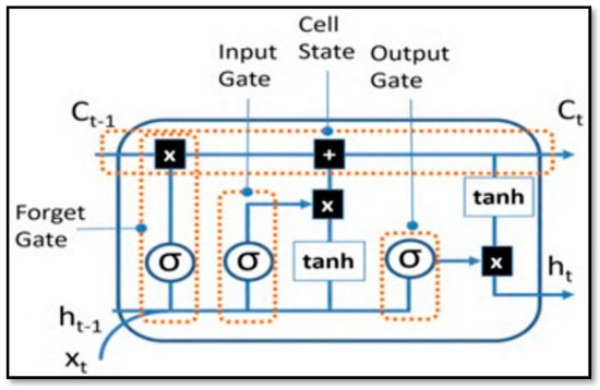 The Long Short-Term Memory (LSTM) network is a specialized architecture of recurrent neural networks (RNNs), designed to learn and preserve information over extended periods. It solves one of the main problems of RNNs, which is vanishing gradients. It helps with time series forecasting because it saves and remembers previous inputs for a long time [24]. LSTM has a string-like structure consisting of blocks of memory cells from which data flows through input, output, and forget gates. These gates are responsible for what is read, written, and stored in the cell, as shown in Figure 1, where X, C, and h symbolize the cell and its input and output values. The symbol t represents the value of the current time step, and (t − 1) indicates the value of the past time step. tanh is the hyperbolic tangent, while σ represents the sigmoid function. The × and + operators are the multiplication and addition of elements, respectively.
