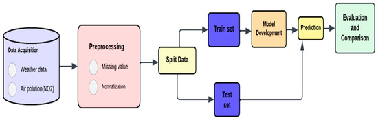 Typically, training a robust deep learning model requires a substantial amount of data. As the two years of recordings that were collected to apply the descriptive analysis may not be sufficient for deep learning model training, we collected daily readings from 1 August 2018 to 31 April 2023 to develop the deep learning model. This research focused on the development of the deep learning model on NO2 that enters the atmosphere through natural processes (lighting, wildfires, and microbiological processes in soils) and human activities (particularly the burning of biomass and fossil fuels) [42].