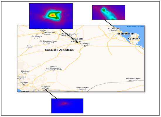 Daily data were collected for three cities in Saudi Arabia considering specific industrial and agricultural characteristics and population density (Al Jubail, Najran, and Al Riyadh). We used the Sentinel-5P/TROPOMI Level 3 Offline (OFFL), which is part of the European Earth observation program “Copernicus” launched by the European Space Agency (ESA) [40]. This remote-sensing satellite is used to monitor air pollutant concentrations, including NO2, O3, CO, HCHO, and SO2. These concentrations were measured with the help of the TROPOMI [41]. Humidity data (IDAHO_EPSCOR/GRIDMET), precipitation data (UCSB-CHG/CHIRPS/DAILY), temperature data (MODIS/061/MOD11A1), and wind speed data (NASA/GALDAS/V021/NOAH/G025/T3H) were also obtained.