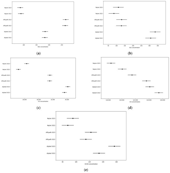 Regarding the O3 plot (Figure 4d), it is clear that in the year 2022, each city displays a significant difference in the concentration of this pollutant. The same can be said for the year 2023. However, the differences in the concentrations across the years have a significant effect only in Najran and Al Riyadh. The plot for HCHO (Figure 4e) shows significant differences between the concentrations of this pollutant across the three cities in each year individually. However, the comparison of the pollutant concentrations between the years reveals a significant effect only in Al Jubail.