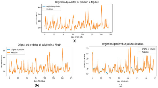 Original and predicted values of NO2 levels in the improved LSTM model with Time2Vec for the three cities. The x-axis represents the test data, while the y-axis represents the concentration of NO2. (a) Al Jubail; (b) Al Riyadh; and (c) Najran.