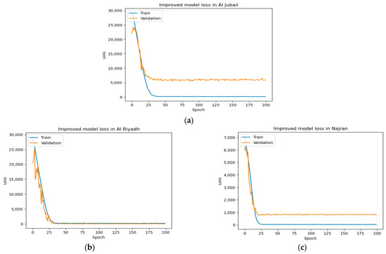 Training and validation of the improved LSTM model for the three cities. (a) Al Jubail; (b) Al Riyadh; and (c) Najran.