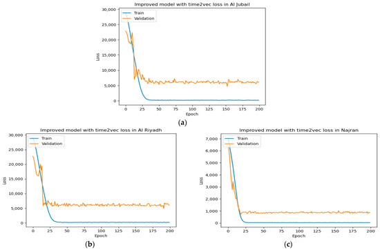 Training and validation of the improved LSTM model with Time2Vec for the three cities. (a) Al Jubail; (b) Al Riyadh; and (c) Najran.