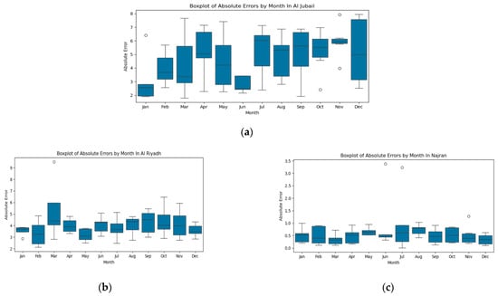 Box plots showing the expected deviation during each month of each year for the three cities. The line in the box represents the mean absolute error between the original and predicted values. The small circles represent extreme values. (a) Al Jubail; (b) Al Riyadh; and (c) Najran.