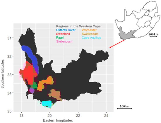 - Wines of South Africa (WOSA). Winegrowing Areas—Winelands of South Africa. 2022. Available online: https://www.wosa.co.za/The-Industry/Winegrowing-Areas/Winelands-of-South-Africa/ (accessed on 11 January 2022).