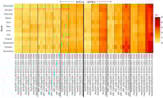 Monthly mean temperature change in Olifants River projected by the nine GCM-RCM pairs for the near-term, mid-term and the end of the century (separated by vertical lines) compared to the reference period 1981–2000. The left part of the diagram represents the RCP2.6 scenario, while the right part shows the results for the RCP8.5 scenario.