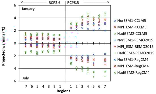 Comparison of temperature changes during the warmest and coldest months between the mitigation (left) and RCP8.5 (right) scenarios at the end of the century across the selected wine regions: 1 = Cape Agulhas, 2 = Swellendam, 3 = Stellenbosch, 4 = Paarl, 5 = Worcester, 6 = Swartland, 7 = Olifants River. Reference period: 1981–2000. The projections for January (upper part) and July (lower part) are shown. All the other months are shown in Figures S6–S15.