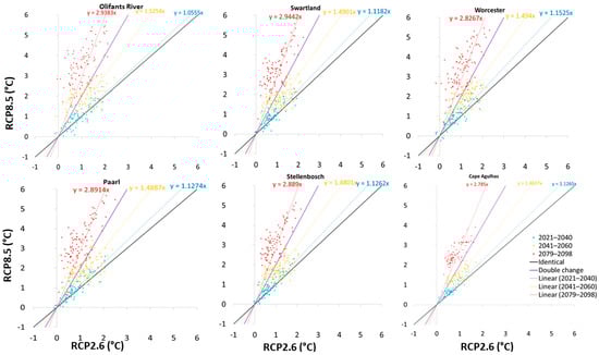 The linear regression method was used to determine the relationship between the two scenarios (i.e., mitigation scenario and RCP8.5) over time (Figure 5). Obviously, the magnitude of the difference between the two scenarios increases with time in all the selected regions wherein the projected change under the RCP8.5 is expected to be almost three times greater than the projected warming under the RCP2.6 mitigation scenario, with regression lines ranging between y = 1.9x and y = 2.94x across the wine-growing regions. This confirms a strong correlation between temperature increases and the radiative forcing changes due to increased greenhouse effects [25] that highlights a significant difference between the two scenarios.