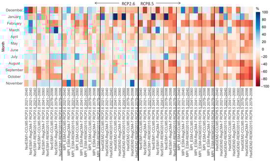 Monthly precipitation changes in Olifants River projected by the nine GCM-RCM pairs under the mitigation and RCP8.5 scenario during the near term, mid-term and end of the century compared to the reference period 1981–2000. The left part of the diagram represents the RCP2.6 scenario, while the right part shows the results for the RCP8.5 scenario.