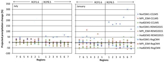 A comparison of precipitation changes between the mitigation (left) and RCP8.5 (right) scenarios during the wettest (July) and driest (January) months at the end of the century across the selected wine regions: 1 = Cape Agulhas, 2 = Swellendam, 3 = Stellenbosch, 4 = Paarl, 5 = Worcester, 6 = Swartland, 7 = Olifants River. Reference period: 1981–2000. The projections for July (on the left diagram) and January (on the right diagram) are shown. All the other months are shown in Figures S21–S30.