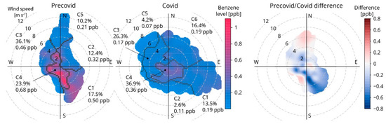 Figure 1 visualizes the potential spatial distribution of benzene sources before and during the pandemic, enabling a direct comparison. The most intense sources, located in the N, NW, W, S, and SE, experienced significant reductions or were deactivated following the emergency measures. In the S and E areas, observed concentrations decreased by up to 0.8 ppb. However, new emission sources emerged in the N and SW areas.