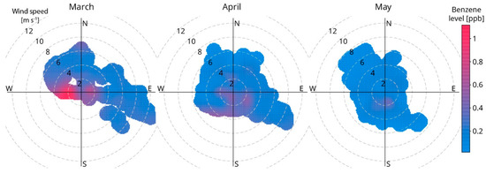 The March state of emergency significantly impacted air quality, primarily driven by movement restrictions, institutional closures, reduced industrial activity, and decreased traffic. These combined factors led to more stable benzene levels with smaller variations. Despite the sampling site being influenced by light to fresh breeze winds (2 to 10 m s−1) from the north and east, regions typically associated with intense anthropogenic activities, no significant contribution to benzene concentrations was observed from these areas, likely due to the imposed governmental measures and subsequent changes in human behavior (Figure 2). Additionally, the onset of the state of emergency coincided with the transition into the warmer part of the year, suggesting that seasonal atmospheric changes and meteorological factors also contributed to the observed decrease in benzene concentrations. While lockdown measures were a dominant factor, the role of seasonal and meteorological variability cannot be overlooked. Future research will further refine this assessment by explicitly accounting for seasonal influences in a more comprehensive environmental analysis.