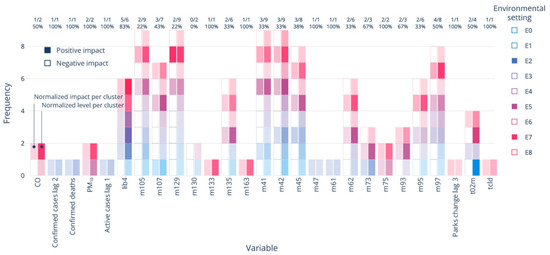 The global explanation of the best-performing model (Gradient boosting model optimized with SCA metaheuristics, with MAE 0.034, max error 0.34, MSE 0.003, RMSE 0.056, MAPE 0.168, and R2 0.94—MAE improvement of 15.1% compared to the non-optimized model) using SAGE revealed that 81 out of the 404 analyzed variables accounted for 95% of the global impact for benzene level prediction during the state of emergency (Table S4, Supplementary Materials). Notably, only 15 variables emerged as having a global impact greater than 1% (in descending order: m129, m41, m105, m97, m42, m45, m107, m95, m135, m62, m133, PM10, m93, m163, and m73). Utilizing our clustering approach with SHAP explanations, we identified nine distinct groups of variable impacts, each representing a specific environmental setting (E0–E8). This method sheds light on how key factors sculpt the environmental context that affects benzene concentrations, particularly in emergency situations, like a pandemic, where changes in human activities play a significant role (Table 1). Additionally, a tenth group, E-1, remained unclustered, encompassing data instances likely to represent outliers or transitional regimes, rendering them unsuitable for categorization within a specific environmental setting.