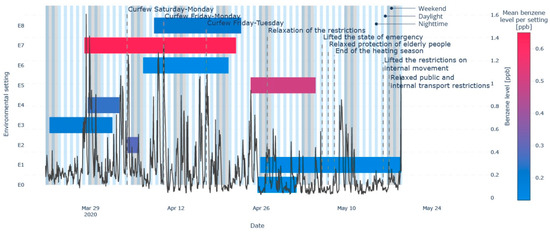 At the end of the first week of the state of emergency, as the weekend began, benzene concentration patterns were influenced by the emergence of two additional environmental settings, E7 and E4 (Figure 4). Occurrences of E3 reappeared only in the middle of the second week of the state of emergency, but this setting faded before the second weekend, coinciding with the first implementation of the curfew.