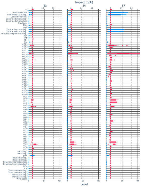 Distribution of the most important variable levels (blue) and impacts (red) for the environmental settings E3, E4, and E7.